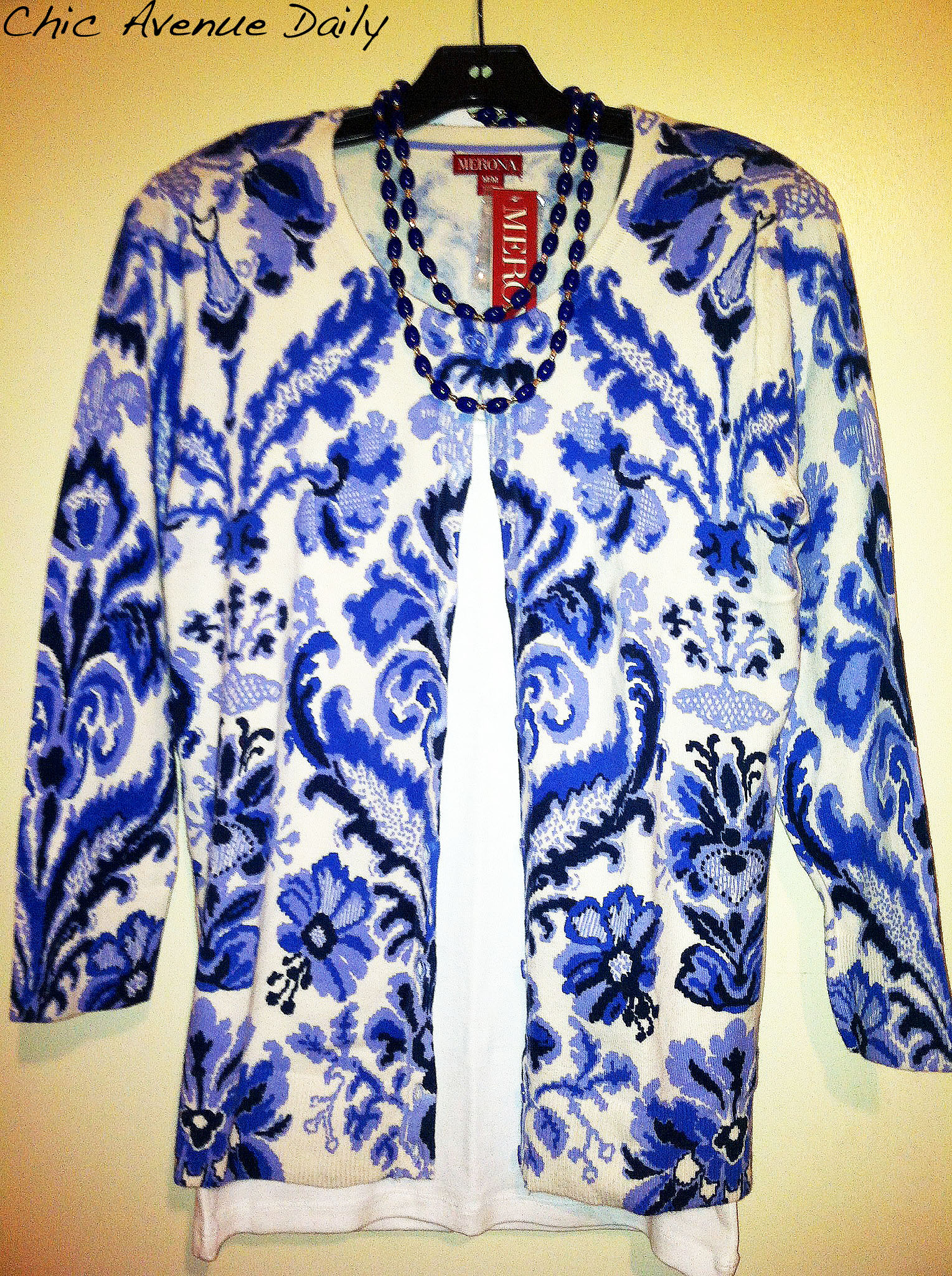1. Target – “Merona Women’s Crew Neck Cardigan Sweater” – In Color: Blue – $22.99