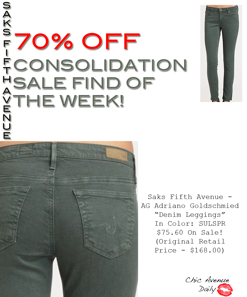 One of my favorite denim brands by far is AG By Adriano Goldschmied. Their jeans just always have the right fit for my body frame. Besides being comfortable, form hugging and durable, AG’s denim is extremely versatile with dozens of options in regards to wash and fit. Of course with high quality denim, comes a hefty price tag. These jeans usually run anywhere from $168.00-$215.00 a pair at specialty boutiques and luxury department stores! So I really rely on finding good sales where I can purchase these bad boys without hurting my wallet! Chime in the Saks Fifth Avenue “Consolidation SALE” where prices are slashed 70% off!!!!! As I was searching thoroughly through their sale section I came about a pair of military inspired, army green denim leggings from AG By Adriano Goldschmied for only $75.60, half the price! You know these had to go into my cart immediately and without hesitation! Such a great find on a lovely Saturday afternoon! This sale is still going on now, so go and get you’re shop on before all the goodies are taken!