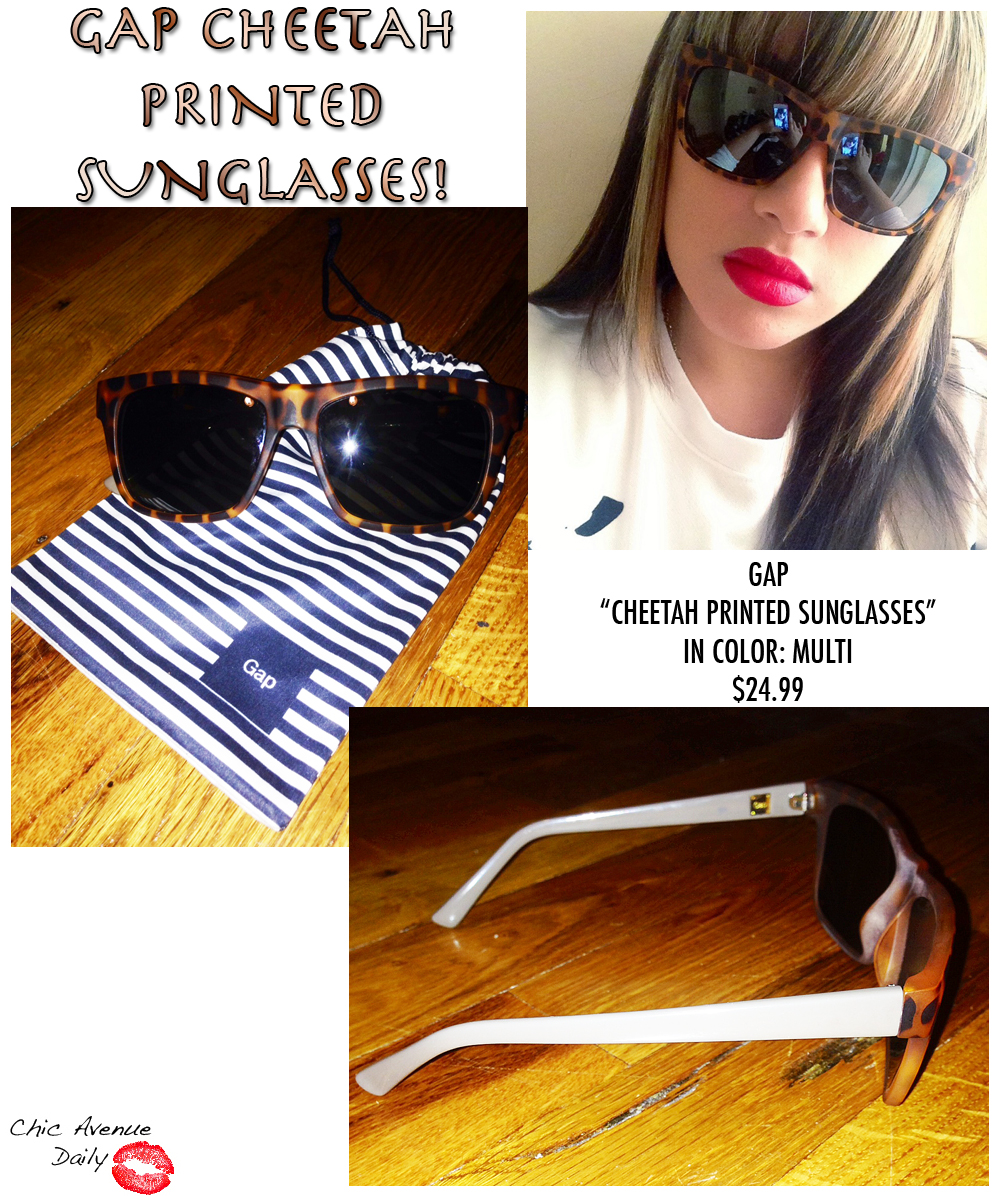 The GAP has been busy rolling out fashion forward/high quality sunglasses this past year within their stores. On one of my shopping trips there these past two weeks, I came across these cheetah printed wayfarer style sunnies that I could not pass up. I love the dark tinted lenses with the contrast color gray legs that give them an extra and unexpected side pop! These babies go with almost everything in my closest and I have been wearing them everywhere I go since I bought them! They also came with their very own protective bag for easy storage. Who wouldn’t want to be seen in these fab & cheetah-licious sunnies?! Pure eyewear purrrrr-fection!