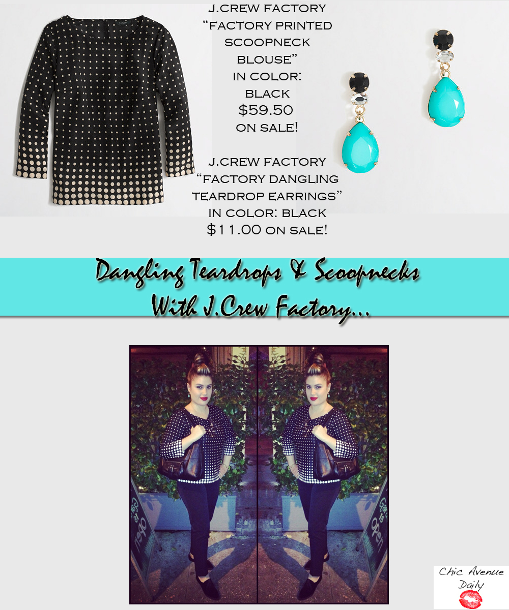This past Friday, I celebrated my birthday yet again (lol) with my 2 girlfriends at this beautiful Italian restaurant in the West Village named Palma. For the occasion, I decided to wear my brand new printed scoop-neck blouse with matching teardrop earrings both from J.Crew Factory. The top was extremely flattering especially because I’m very busty. The print was a subtle yet fabulous way to stand out without being to out there. It was elegant and although it was a tad conservative, I didn’t mind it. Ringing in 27, I feel that you should be able to dress just a little more mature, more classic ya know. As for the earrings, I couldn’t resist that turquoise colored stone that literally jumps at you saying BUY ME! They are so lovely, giving you a little touch of sophistication! They were great buys especially because I got them on sale! I try never to pay full retail on anything I purchase, neither should you, if you can avoid it! 😀
