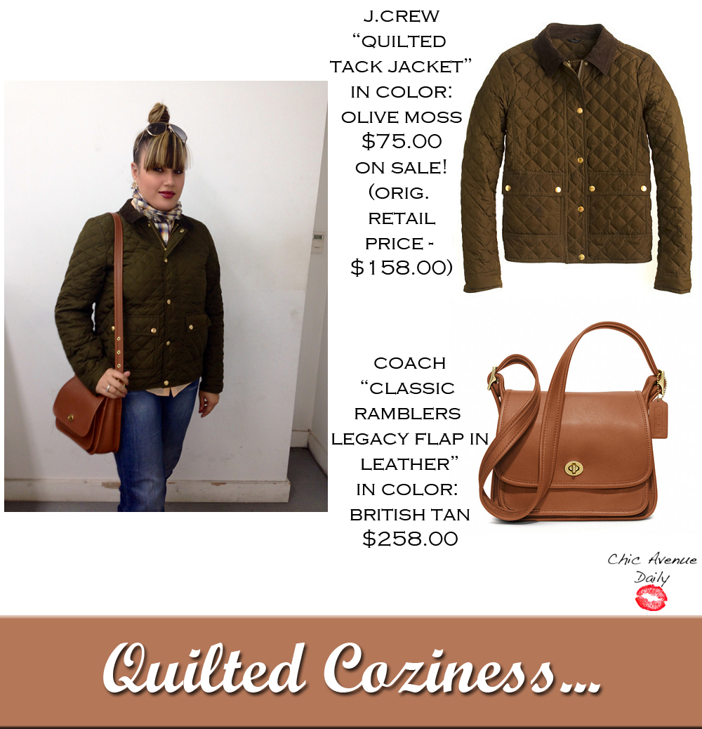 With the Fall weather in full force here in NYC, I like to make sure I bundle up to stay warm and toasty. This olive green, quilted mini puffer jacket from J.Crew fits the bill. Even though its lightweight, the real feather filling keeps you safe from the cold. The cordoroy collar and diamond quilting give you that touch of rustic-ness. And the gold hardware also adds that bit of shine we all need. The interior is not lined, but the seams are beautifully bound in a contrast navy fabric. I paired this jacket with a tanned flap leather Coach bag I got for my birthday last year which in-turn, helped bring the whole look together. I felt this outfit was very reminiscent of classic Ralph Lauren attire. Looks like hunting season is ready to begin lol!
