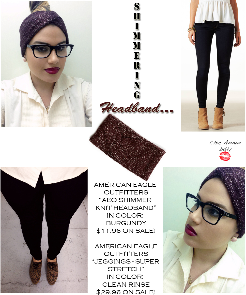 This super soft and cozy burgundy headband from American Eagle is the ultimate fall accessory that every girl should have for those cold winter NYC nights. This slip on style fits easily over your ears and the twisted detail at the front gives it a touch of sass. The subtle gold shimmer is also early holiday perfection. I wore this headband with an old Ralph Lauren button down shirt I scored at a sample sale 3 years ago for $10 and another pair of super stretch skinny jeans also from American Eagle. I love the dark rinse color of this denim as it makes you look about 5lbs lighter! Any jeans that help you look skinnier is a plus in my book!