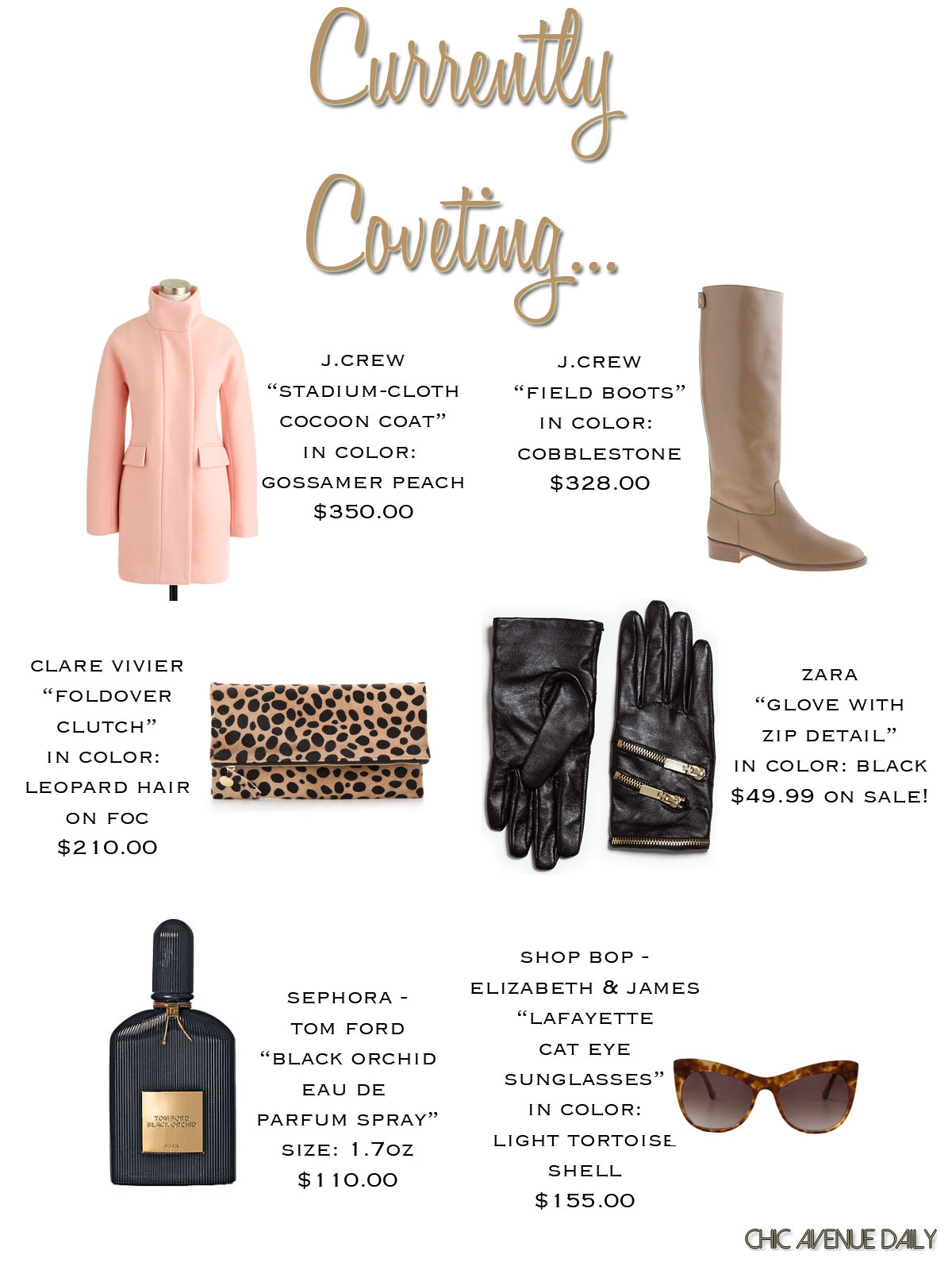 I thought today would be the perfect day to upload a new post on what I’m currently coveting since it’s been about 3 weeks I last posted on the subject (see link on my last currently coveting post below). I feel that each product shown in my collage is so classic and just sizzling with femininity (that leopard clutch is everything!). These are sophisticated fashion staples that will never go out of style and you can use over and over again. The one beauty note that made it on my list, is the Tom Ford perfume (I mean look at that bottle) it reeks of in your face sexiness without being over the top! Hoping that within the next couple of months I can get a few of the items listed, a girl can dream….
